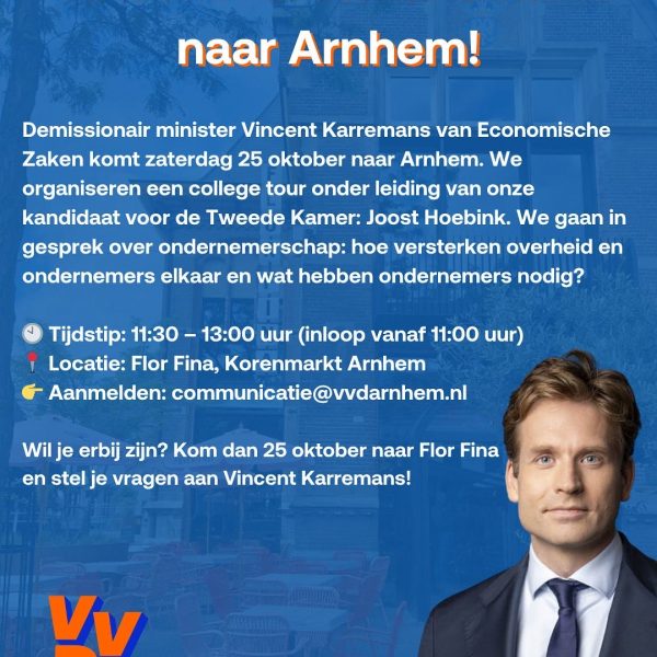 7 oktober 2025Demissionair minister Vincent Karremans van Economische Zaken komt zaterdag 25 oktober naar Arnhem. We organiseren een college tour onder leiding van onze Arnhemse kandidaat voor de Tweede Kamer: Joost Hoebink. We gaan in gesprek over ondernemerschap. Lees ...